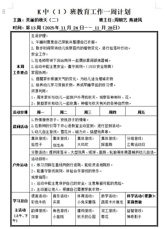 K中1班第13周周计划