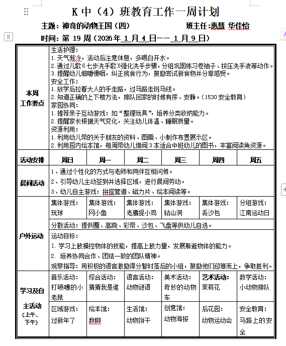 K中4班第19周周计划