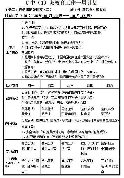 C中1班第7周教育工作计划