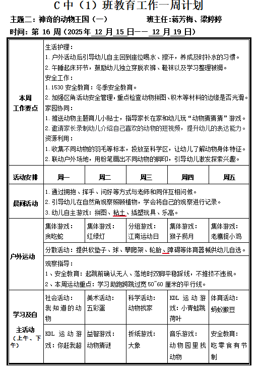 C中1班第16周教育工作计划