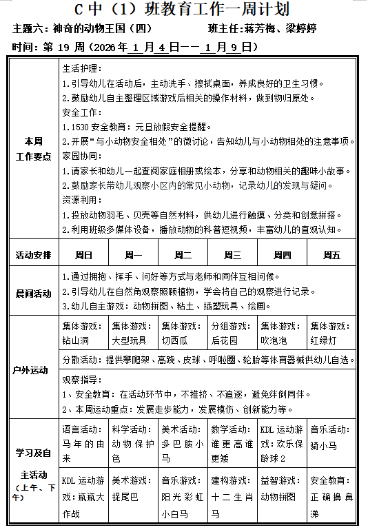 C中1班第19周教育工作计划